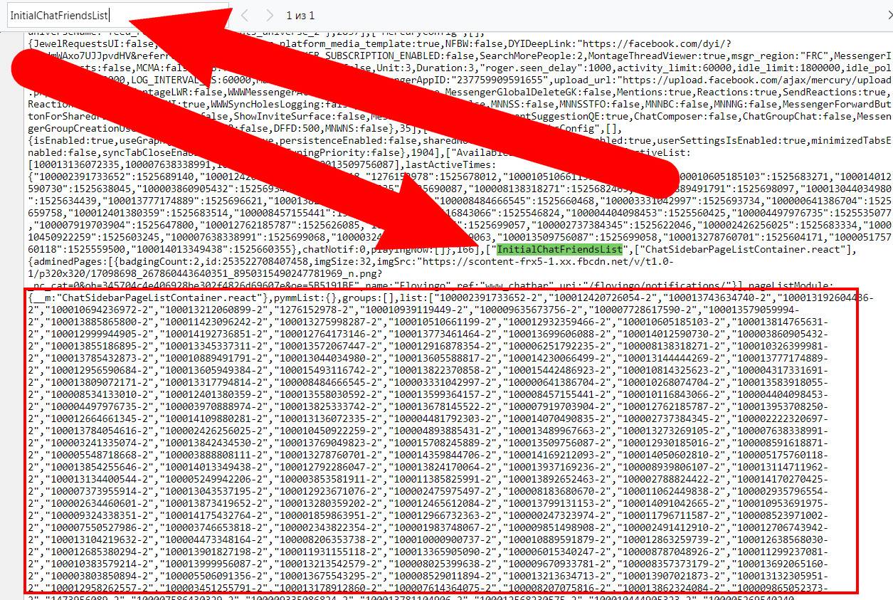 Далее используйте опцию поиска страницы: найдите исходный код при помощи комбинации, затем просто нажмите Ctrl+F, затем введите словосочетание InitialChatFriendsList в открывшееся окошко поиска информации.