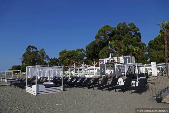 Еще из важного — море, оно чудесное, чистое, бескрайнее, с просторным пляжем — есть дикая зона, для любителей «только я и чайки, есть моя любимая — благоустроенная. И здесь гостям отеля на Адлейба повезло особо — в 2 минутах от вашего порога расположился самый красивый пляжный клуб республики, где всё, как на лучших берегах Европы