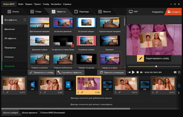 Каталог ВидеоШОУ предлагает стильные динамичные эффекты. С их помощью вы сможете перекрасить видео, заставить его перемещаться, приближаться и отдаляться.