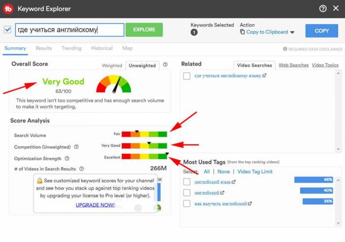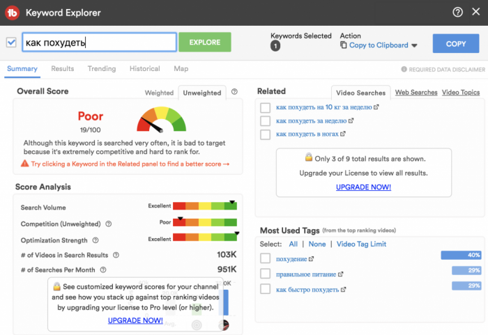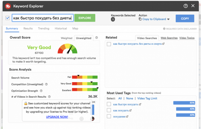 Это помощник, который позволит вам оценить ваше следующее видео с точки зрения потенциальных просмотров и будет ли оно конкурентноспособно. Эти функции в нем бесплатны.