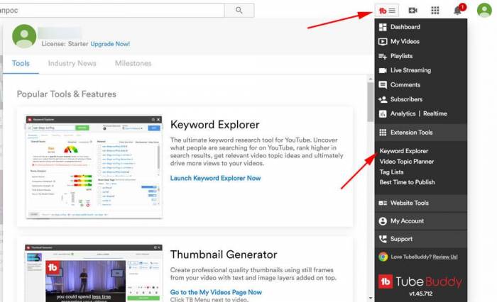 После установки плагина заходим на ютуб, в правом верхнем углу кликаем на красный значок tb и в выпадающем меню кликаем на «Keyword Explorer».