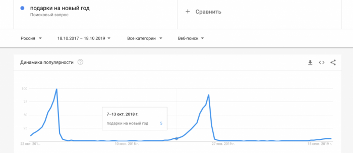 Как это вам поможет? К примеру, вы подумываете снять видео о подарках на Новый Год. Возможно, вы бы сняли такое видео в декабре, но график показывает, что люди начинают делать такие запросы уже с октября. Поэтому, стоит поторопиться.