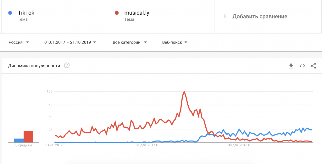 В 2019 году TikTok по-прежнему на волне и этот тренд плавно растущий, тогда как популярность Musical.ly достигла пика летом 2018 и постепенно весь хайп вокруг этого приложения сходит на нет. Вывод: видео о TikTok, вероятней всего, будет интересно людям, а о Musically вообще нет смысла снимать.