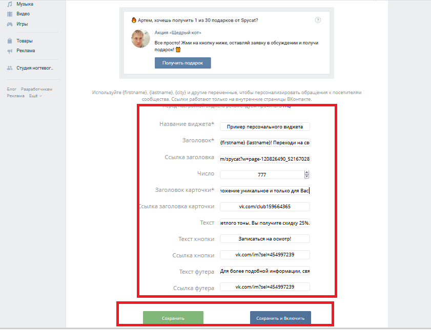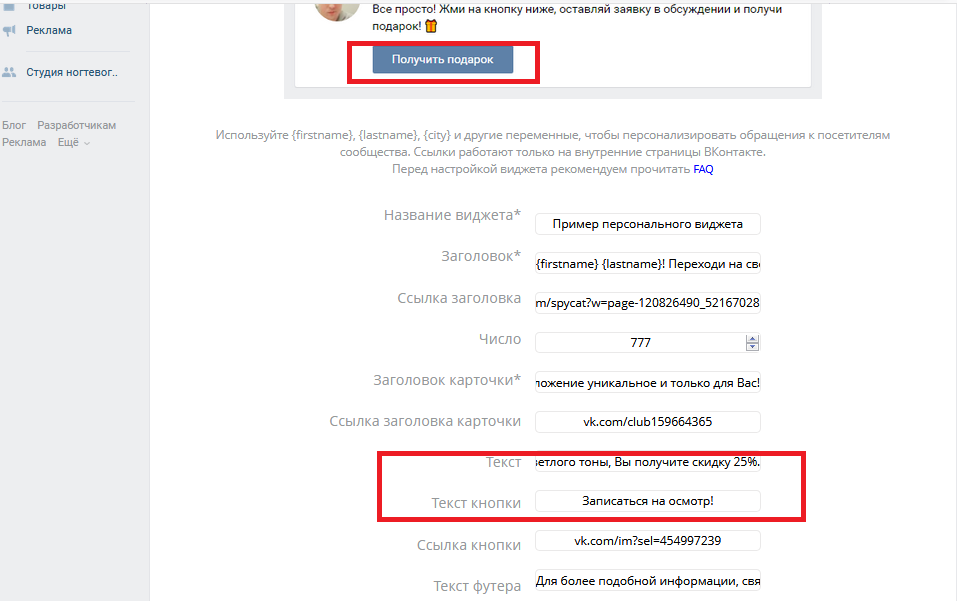 - Заполните текстовые поля. В верхнем поле в примере есть переменная {имя}, второе поле — заголовок, третье — текст, и, наконец, кнопка. Во всех элементах, кроме текста, можно добавить еще ссылку (но только внутри ВК, на внешние сайты нельзя).