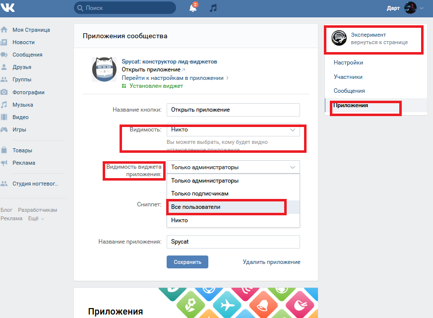 На рисунке показано, что данное приветствие видно только для администраторов группы. Чтобы сделать его видимым всем пользователям, переходим в «Управление сообществом», затем «Приложения» и выбираем во вкладке «Видимость виджета приложения» пункт «Все пользователи».
