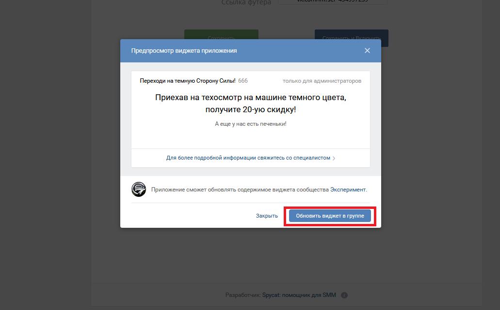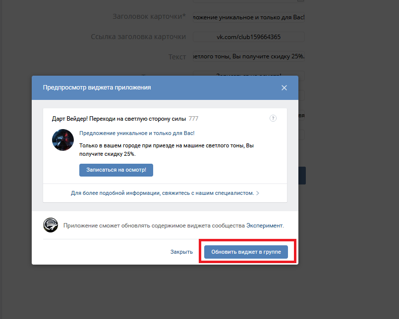 Если нас все устраивает, то жмем «Обновить виджет в группе». Переходим на главную страницу сообщества и наслаждаемся результатом.