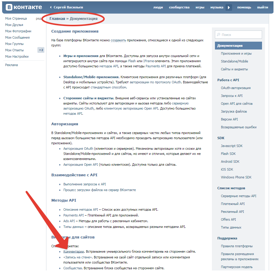 Заходим под своим логином и паролем на страничку Вконтакте. Там переходим по вкладке, в нижнем меню, «Разработчикам», если лень искать, то можете кликнуть вот по этой ссылке http://vk.com/dev. Затем переходите во вкладку «Документация платформы» пункт «Виджеты для сайтов» — «Комментарии» (рис.1)