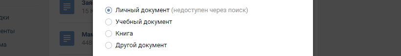 Обратите ваше внимание на тот факт, что при установке параметров – “учебный документ”, “книга”, “другой документ” вы открываете файл для всех зарегистрированных пользователей VK и его смогут найти во внутреннем поиске с возможностью скачивания себе и пересылки друзьям. Так что не в коем случае не загружайте в “документы” приватную информацию, а именно сканы паспортов, пенсионных удостоверений и другую информацию, имеющую ценность