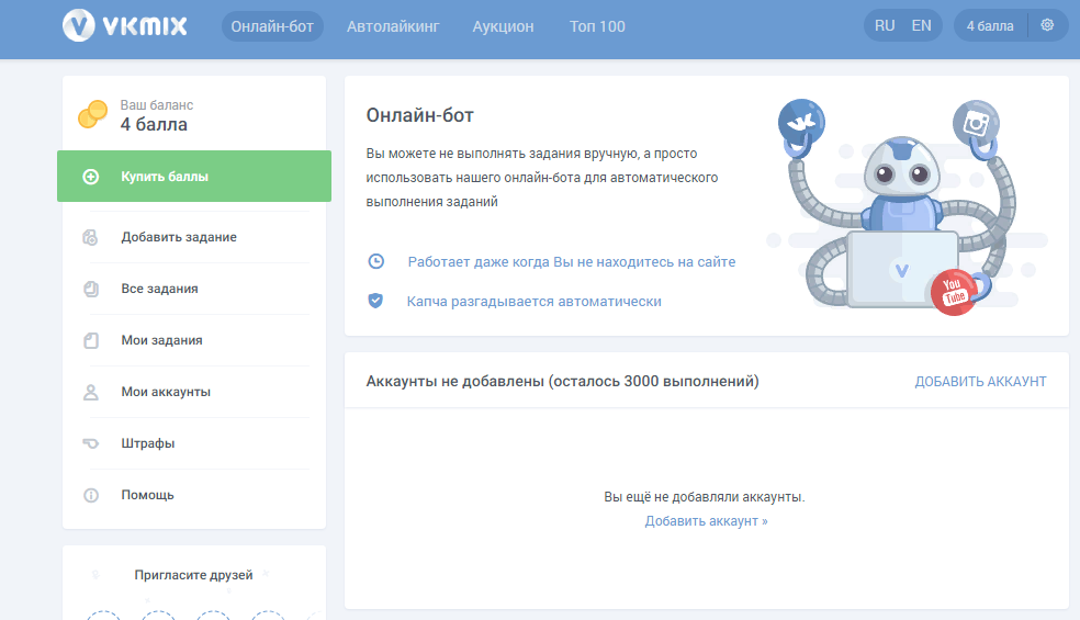Надо бы еще вкратце рассмотреть дополнительные средства, которые предлагает сервис VKMix пользователям для работы. Онлайн-бот помогает выполнять задания на полном автомате. Для его активации нужно просто добавить свои аккаунты, после чего он будет работать не покладая рук от вашего имени и зарабатывать баллы вам на баланс: