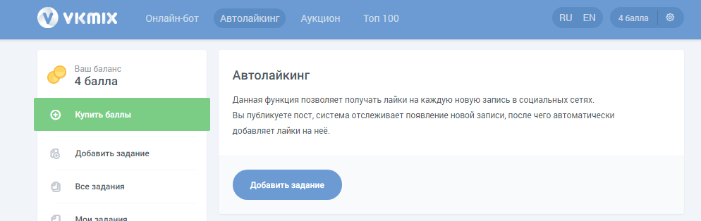 Чтобы его подключить, достаточно перейти во вкладку «Автолайкинг» и нажать кнопку «Добавить задание».