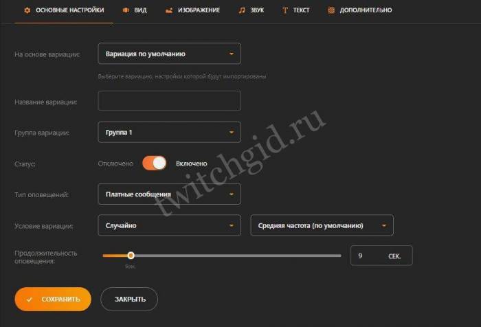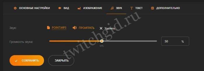 - В разделе “Оповещения”самостоятельно настраиваем параметры пожертвований на стриме. Все настройки виджетов можно менять: от цвета фона до числового порога вывода сообщений на дисплей. Имеется возможность добавления уникальных изображения или анимации, появляющихся при поступлении определенной суммы, или настроить звуковой сигнал из предложенных или загрузив собственный в формате mp3;