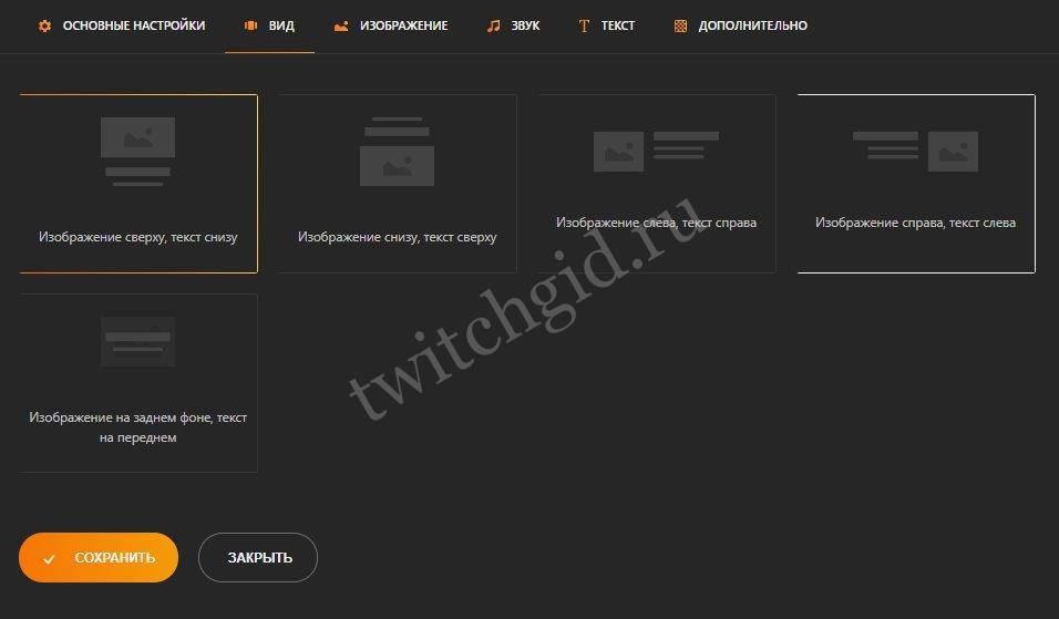 Перейдем к вкладке «Вид». Выбирайте, как расположите изображение и текст – доступно пять вариантов;