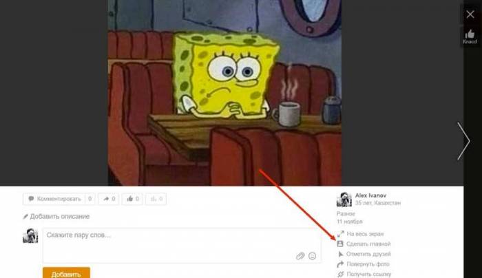 Аналогичным способом перенести на место аватара в Одноклассниках можно любую картинку и изображение из находящихся на странице пользователя альбомов. Для этого просто откройте альбом, подведите курсор к фотографии и выберите пункт «Сделать главной».