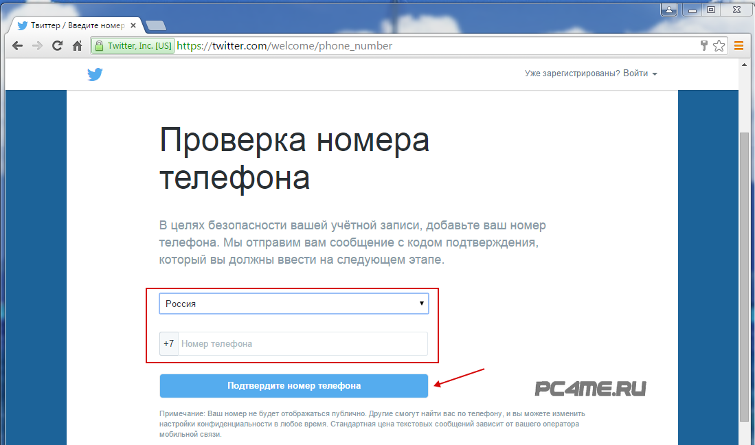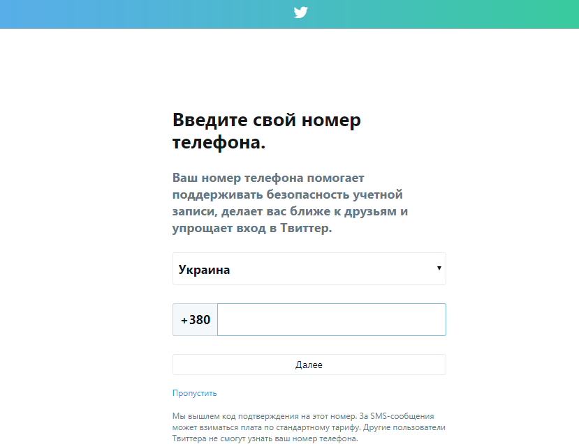 Twitter сообщает нам, что номер телефона сохраняет учётную запись в безопасности, делает нас ближе к друзьям и облегчает вход на сайт. С этим нельзя не согласиться, поэтому мы выполним это и введем свой номер: