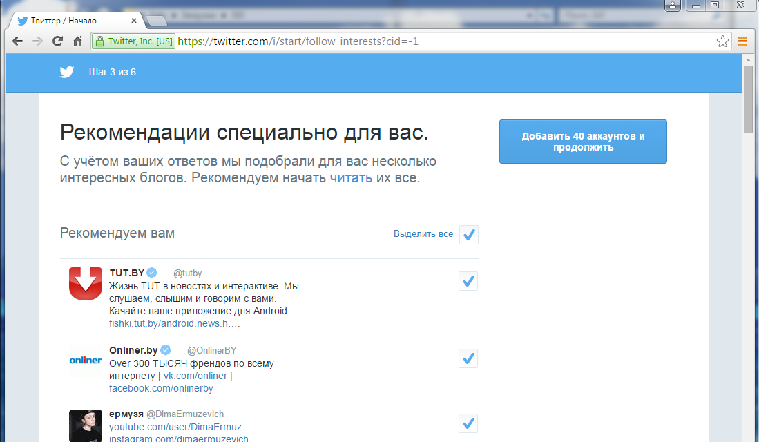 . Первое из них состоит в подписке на одного или несколько пользователей Twitter (твиттерян). С этой целью надо заполнить соответствующие чекбоксы (проставить галочки) напротив наиболее интересных: