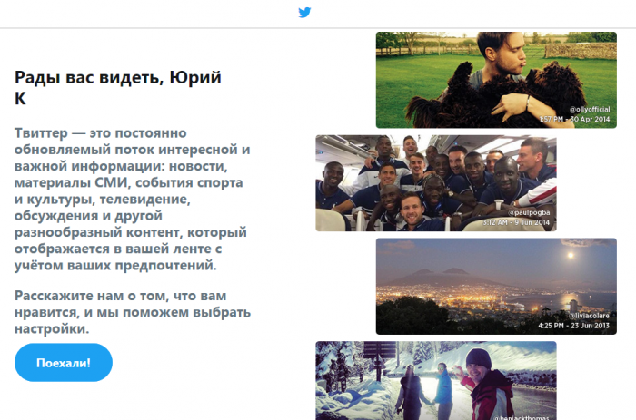 После введения имени при регистрации на экране появится приветствие. Нажав «Поехали», можно перейти к дальнейшим настройкам профиля.