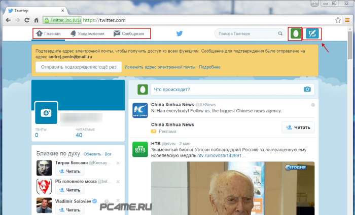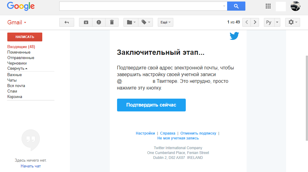 Далее нужно войти в свою почту, открыть письмо от Twitter и перейти по находящейся в нем ссылке для подтверждения. Вас перебросит в окно аккаунта, где прочитаете сообщение, что емайл подтвержден. На этом регистрация окончательно и успешно завершена.