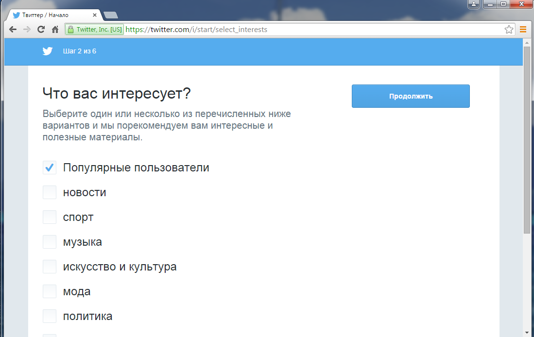 Система также предложит вам включить или отключить возможность «Адаптировать Твиттер исходя из недавно посещённых веб-страниц». По умолчанию она включена, и это дает возможность социальной сети немного подстроить «окружающий мир» исходя из ваших приоритетов (их вы будете заполнять на следующих этапах регистрации).