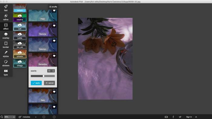 - состаривать фото и обычные фильтры-пресеты с изменением цвета;